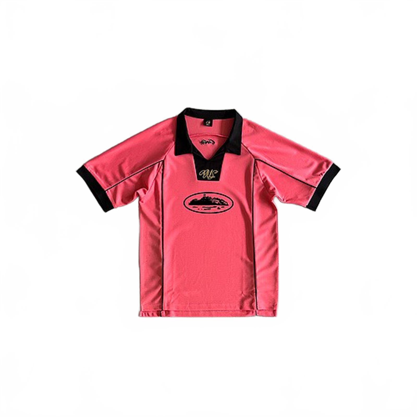 The Corteiz Talismo Football Jersey is a brand new men's football shirt in a Pink & Black. Made from polyester jersey fabric, this short sleeve shirt features a V-neckline and embroidered accents. It is designed for summer sports enthusiasts and is machine washable for easy care. With a sports theme and breathable features, this jersey combines style and functionality for the modern football player.