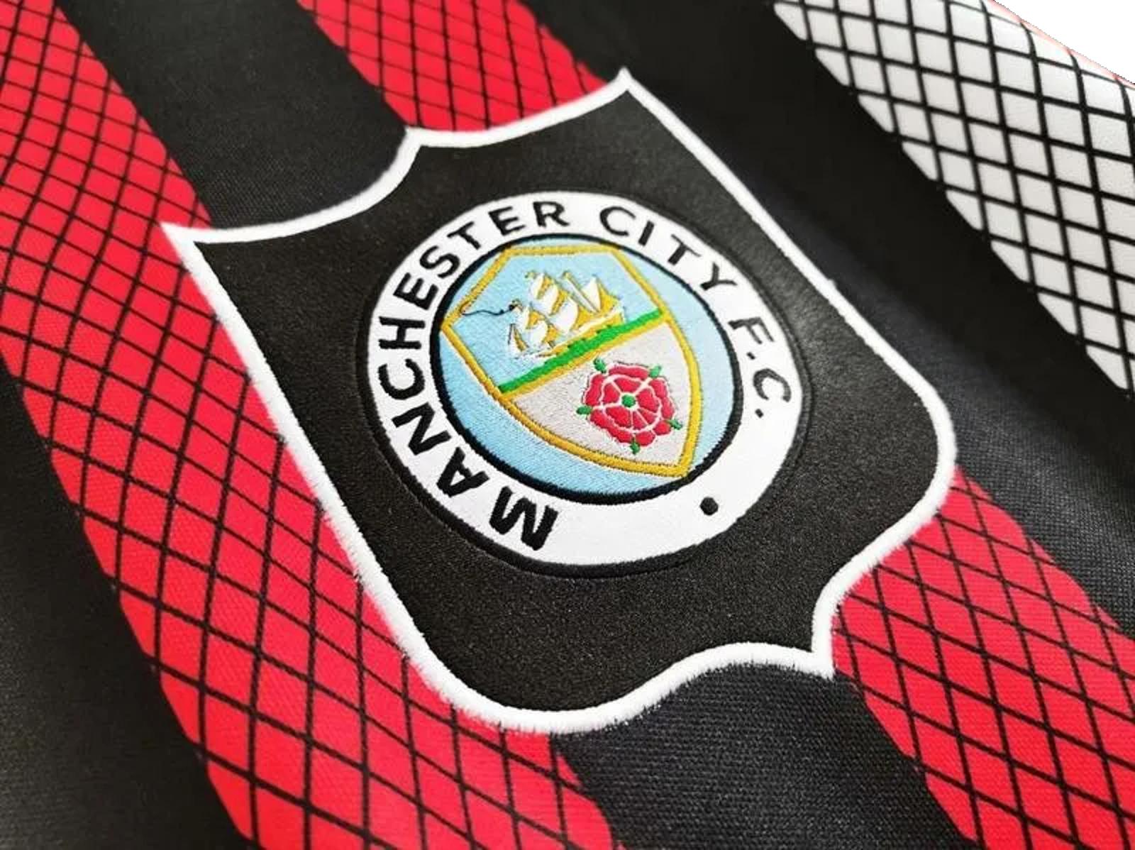 Throw it back to the 90s with the Manchester City 94/96 Retro Away Jersey – Red & Black Edition.