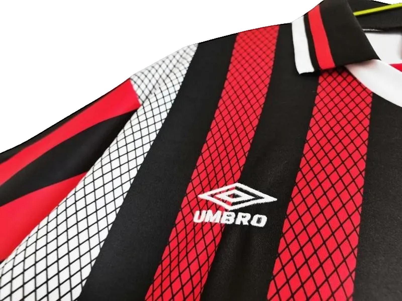 This classic Umbro design brings vintage vibes with bold red and black stripes, retro sponsor detailing, and the iconic City crest – a true piece of football history.
