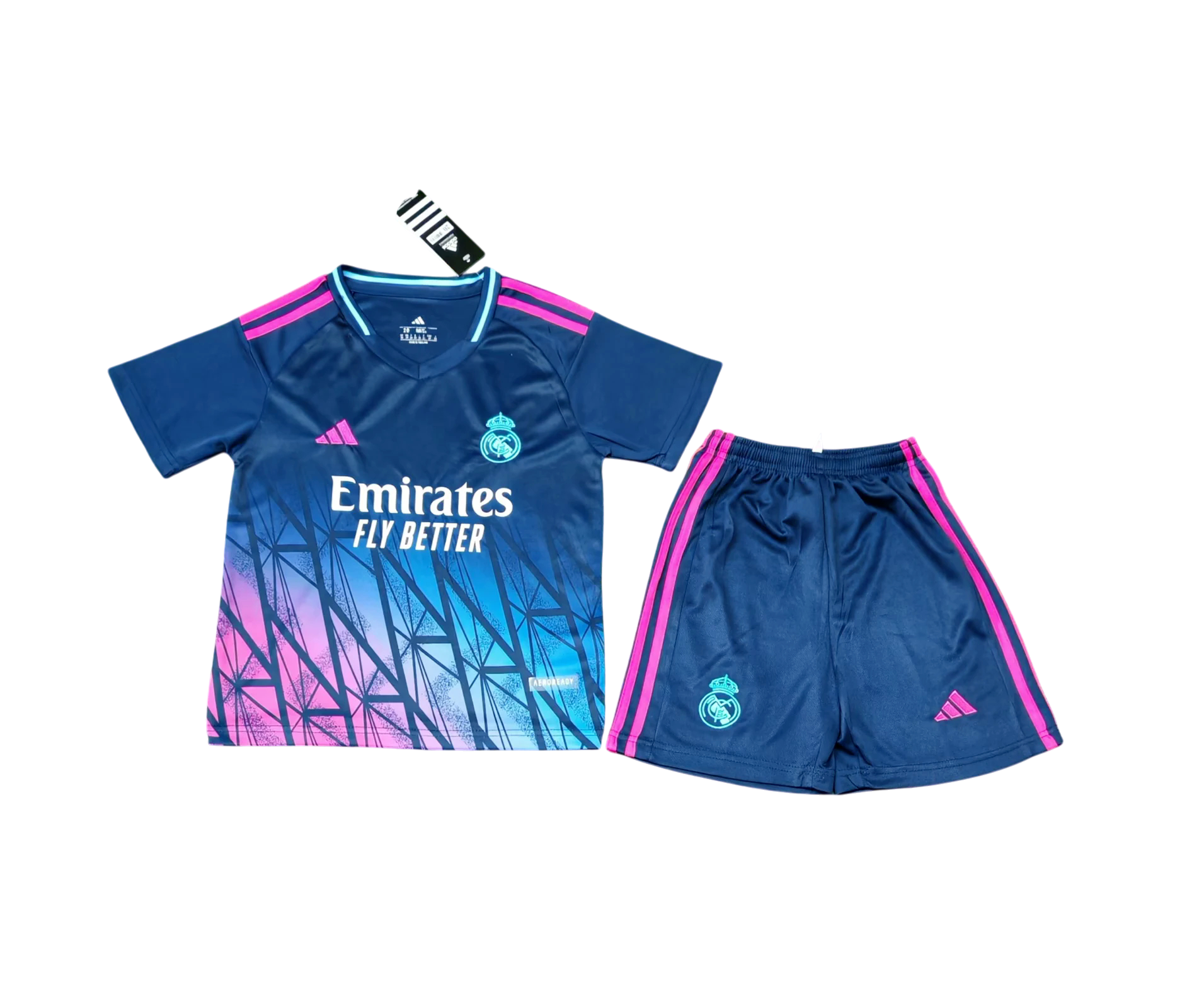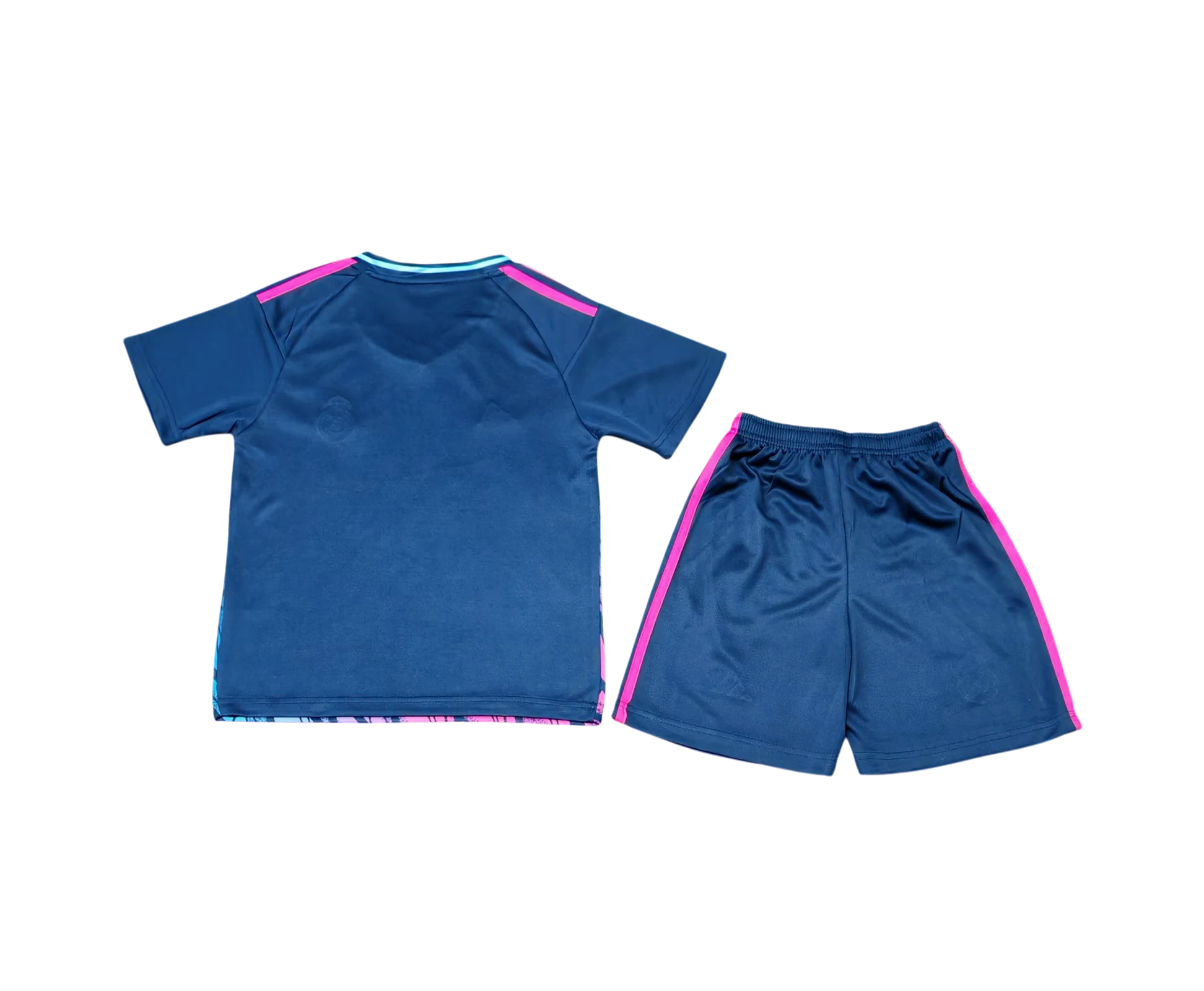 The shirt features a deep navy base with vibrant pink accents and a dynamic geometric gradient design, paired with matching navy shorts for a sleek finish. Crafted with lightweight, breathable fabric and a relaxed athletic fit, this kit ensures freedom of movement and all-day comfort. Finished with the iconic Real Madrid crest and premium detailing, it’s a must-have for future champions.