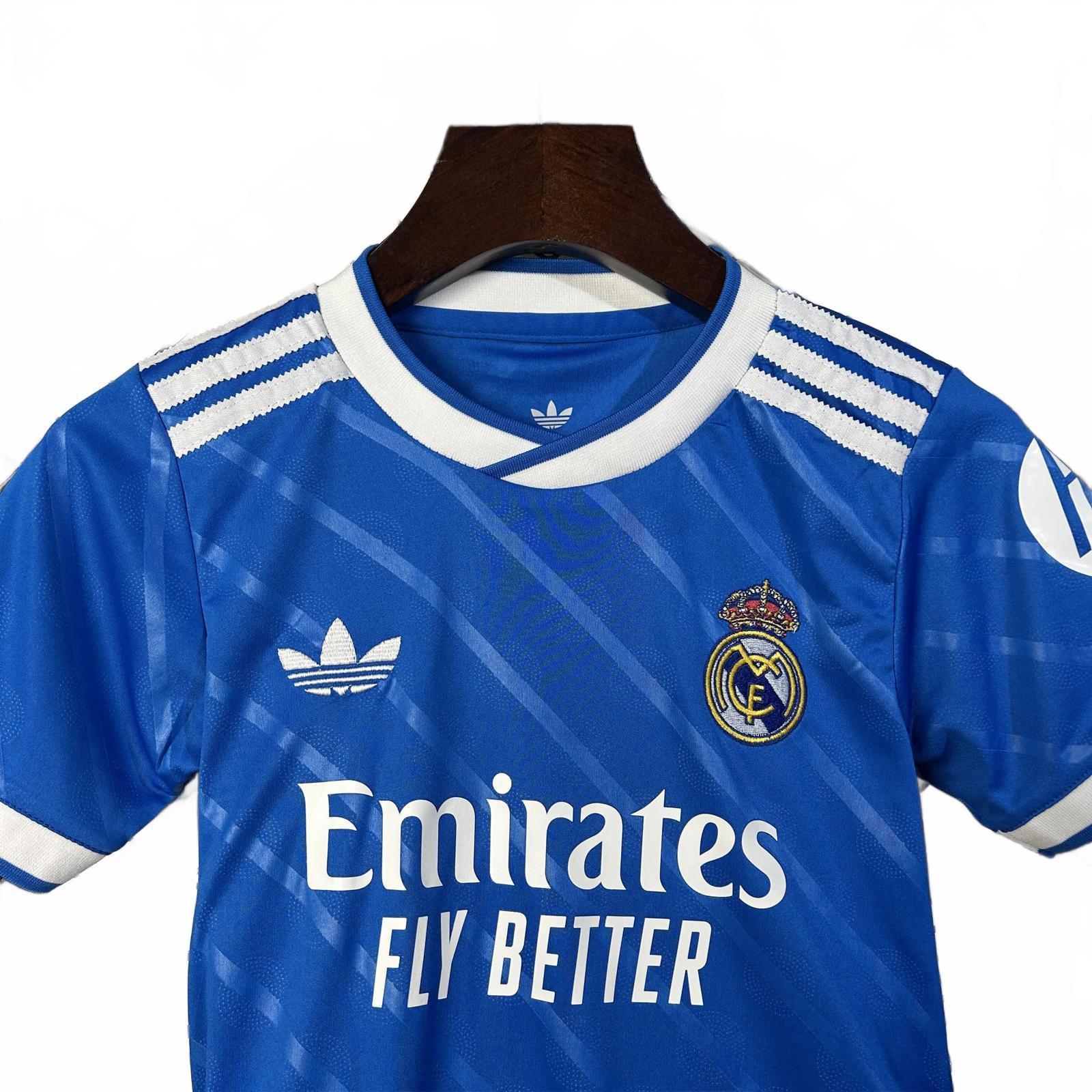 Fresh colours, same legacy – the Real Madrid 2025/26 Kids Third Kit by Adidas drops in bold blue for young fans who rep Los Blancos with pride.