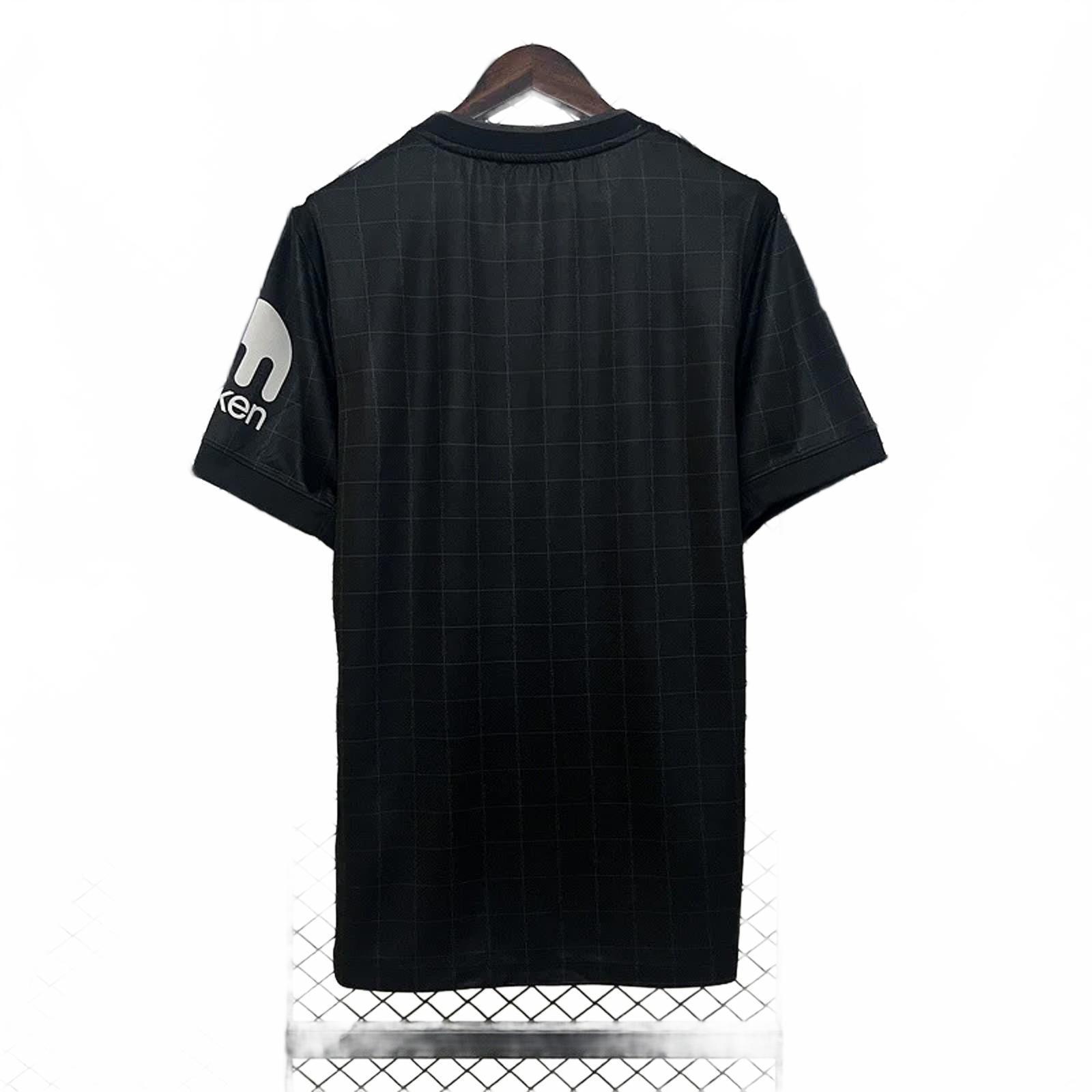 This season’s away shirt marks a powerful return to black for the first time in over a decade, blending stealthy design with subtle club identity. Featuring tonal square tile graphics that spell out “SPURS,” grey accents, and crisp white logos, it’s a modern tribute to North London pride.